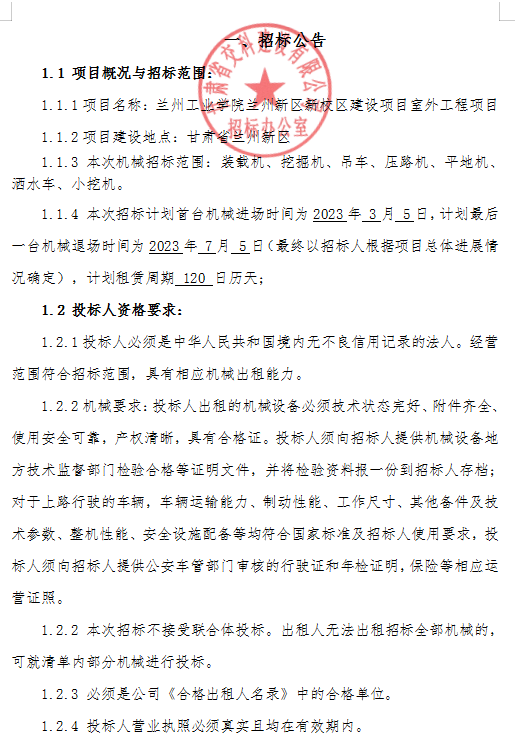 兰州工业学院兰州新区新校区建设项目室外工程项目机械租赁招标公告