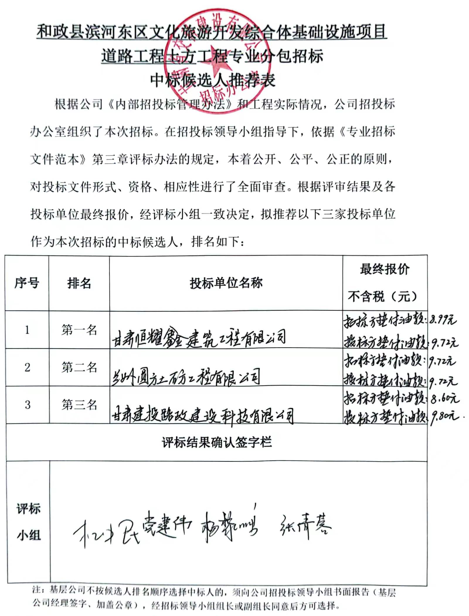 和政县滨河东区文化旅游开发综合体基础设施项目道路工程土方工程中标候选人及中标通知书