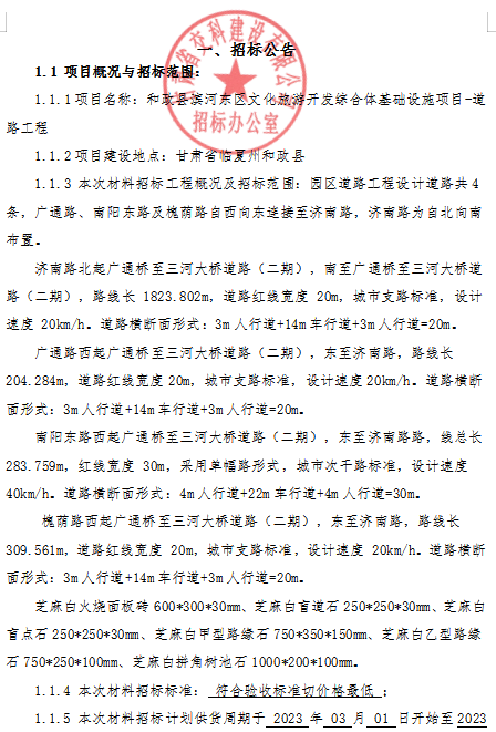 和政县滨河东区文化旅游开发综合体基础设施项目-道路工程材料招标公告