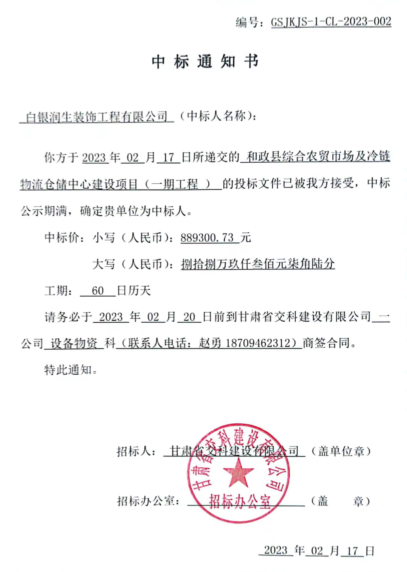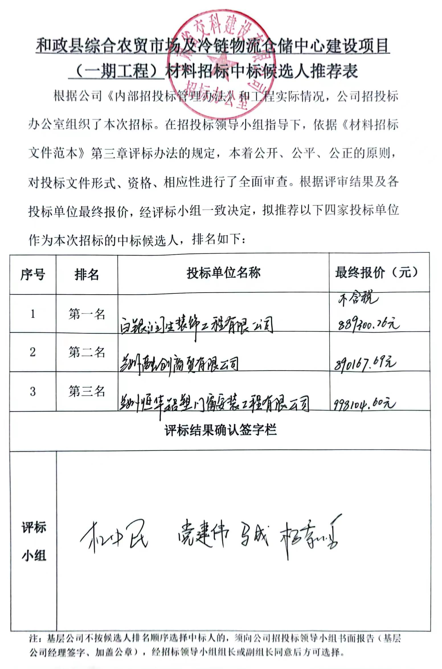 和政县综合农贸市场及冷链物流仓储中心建设项目(一期工程 )材料招标中标候选人及中标通知书