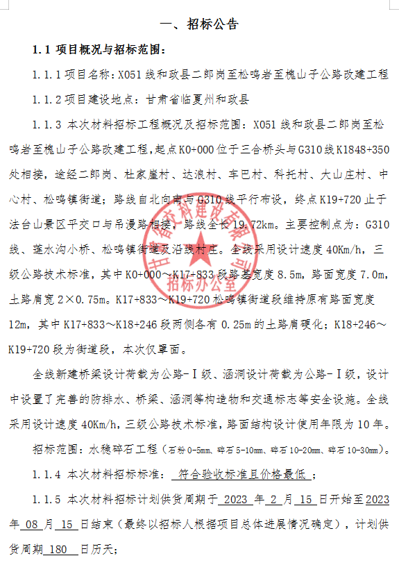 <h3>X051线和政县二郎岗至松鸣岩至槐山子公路改建工程水稳碎石材料招标</h3>