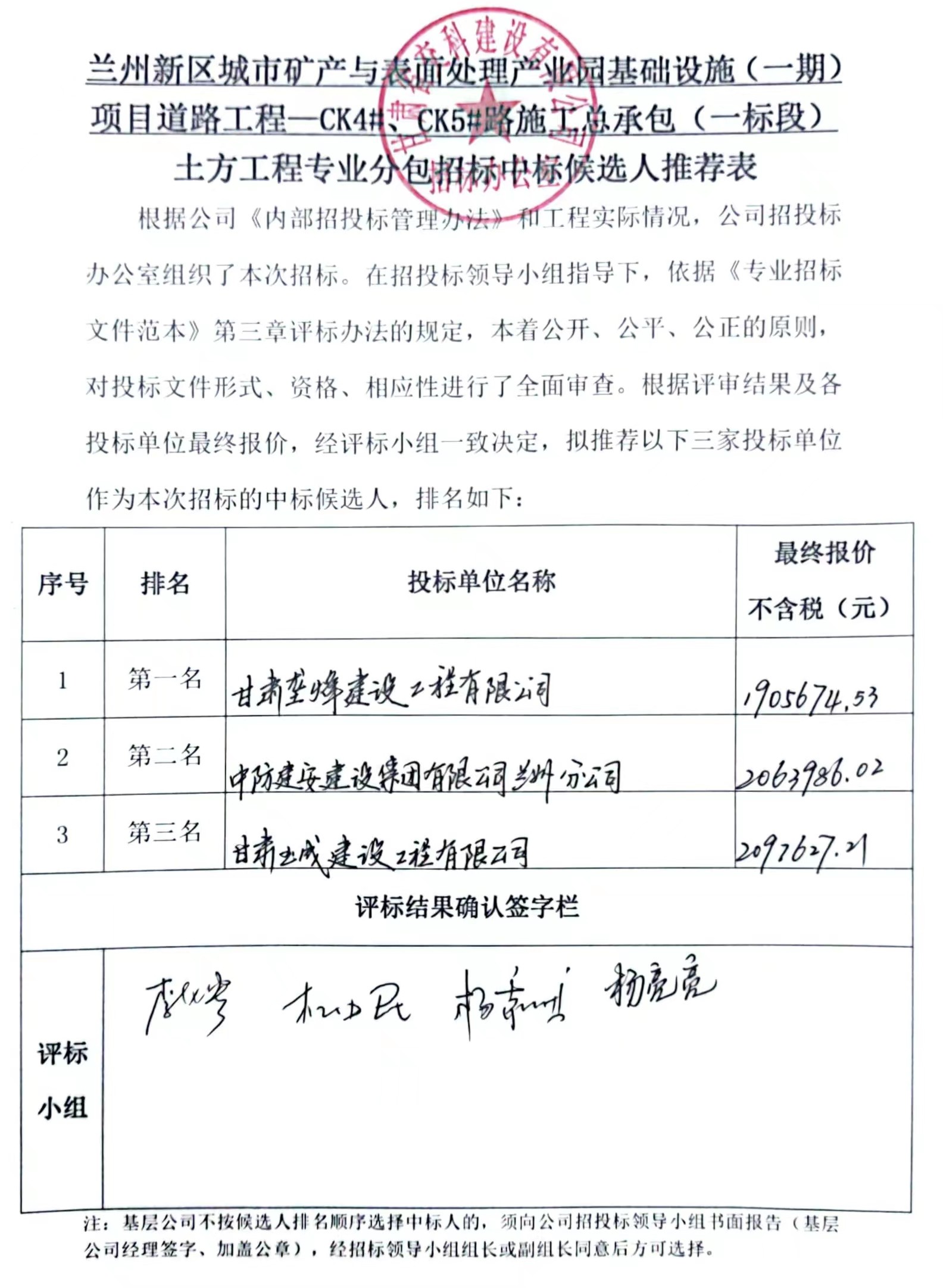 兰州新区城市矿产与表面处理产业园基础设施(一期)项目道路工程—CK4#、CK5#路施工总承包(一标段)中标候选人及中标通知书