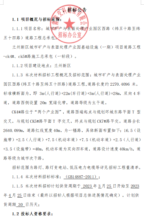 城市矿产与表面处理产业园区西路(纬五十路至纬五十四路)道路工程总承包 兰州新区城市矿产与表面处理产业园基础设施(一期)项目道路工程-ck4#、ck5#路施工总承包(一标段)招标公告