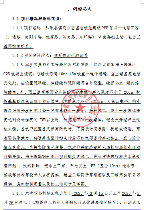 和政县滨河东区基础设施建设PPP项目—道路工程(广通路、南阳东路、槐荫路、济南路、东环路)-济南路挡土墙(包含三维网植草护坡)招标公告