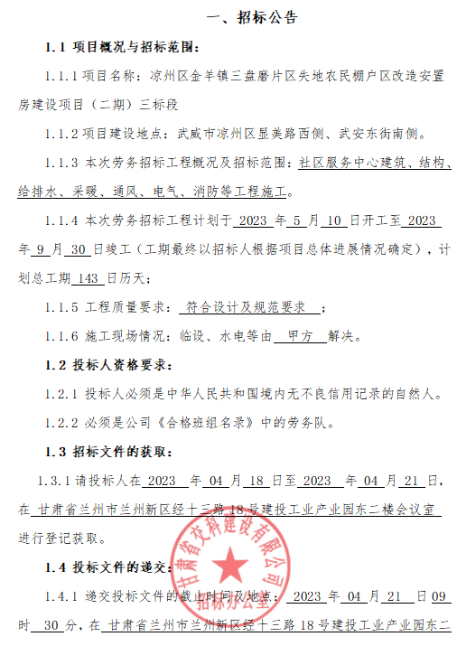 凉州区金羊镇三盘磨片区失地农民棚户区改造安置房建设项目(二期)三标段 社区服务中心劳务招标公告