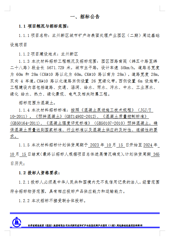 <h3>兰州新区城市矿产与表面处理产业园区（二期）周边基础设施项目-混凝土招标公告</h3>