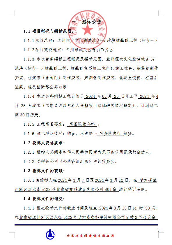 兰州恒大文化旅游城A-57地块桩基础工程(标段一)劳务分包招标公告