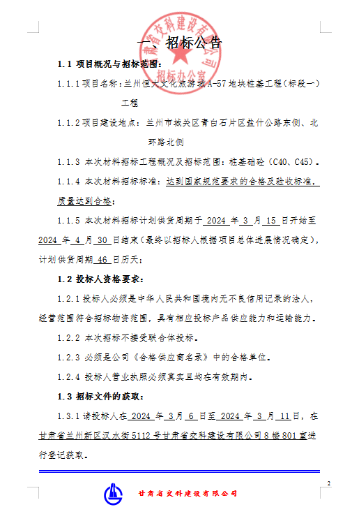 兰州恒大文化旅游城A-57地块桩基工程(标段一)混凝土招标公告