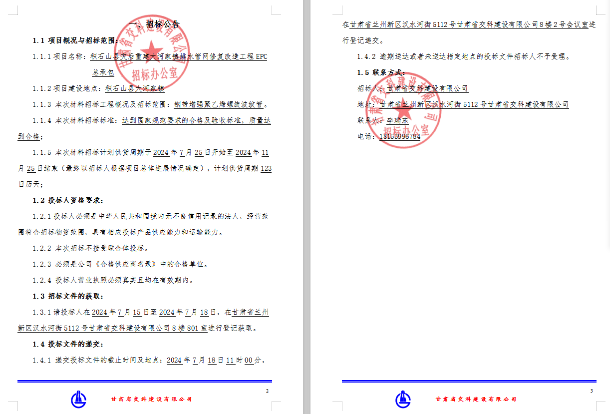 积石山县灾后重建大河家镇排水管网修复改造工程EPC总承包-钢带增强聚乙烯螺旋波纹管招标公告