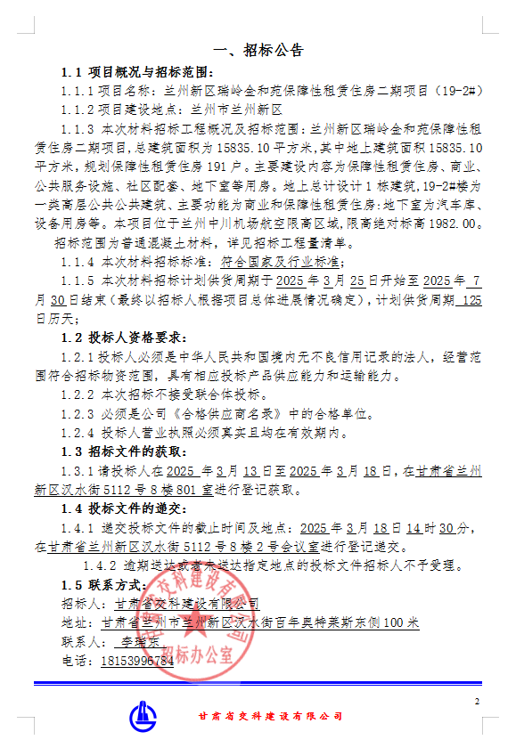 兰州新区瑞岭金和苑保障性租赁住房二期项目(19-2#)混凝土招标公告