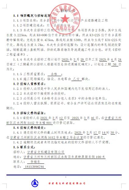 东乡县那勒寺镇沿川经济带产业道路建设工程专业分包招标公告
