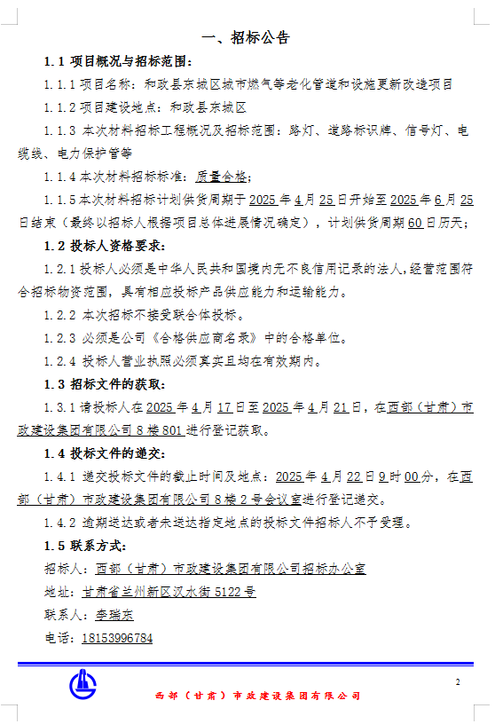 和政县东城区城市燃气等老化管道和设施更新改造项目-路灯、道路标识牌、信号灯、电缆线、电力保护管等招标公告