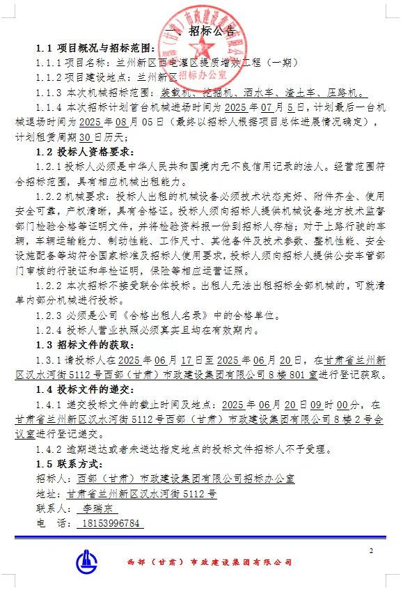 兰州新区西电灌区提质增效工程(一期)机械租赁-招标公告