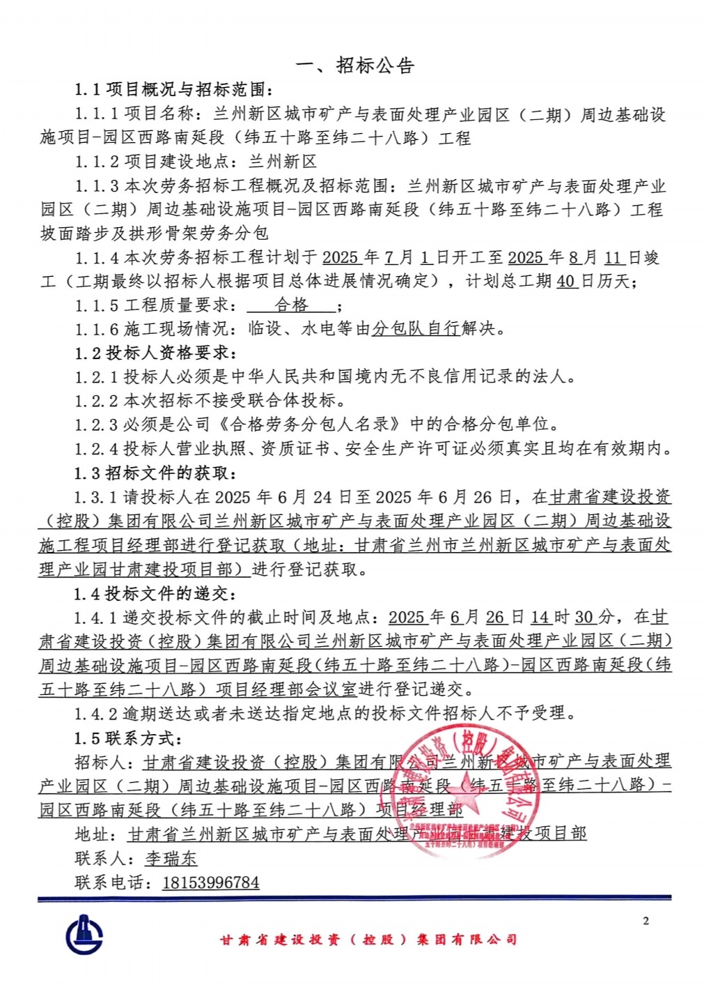 兰州新区城市矿产与表面处理产业园区(二期)周边基础设施项目-园区西路南延段(纬五十路至纬二十八路)工程-劳务分包-招标公告