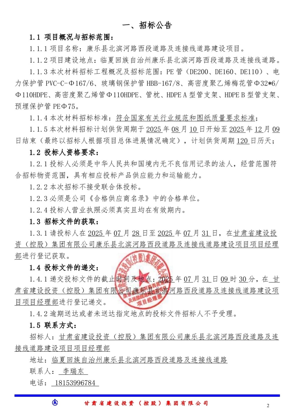 康乐县北滨河路西段道路及连接线道路建设项目-材料招标-招标公告