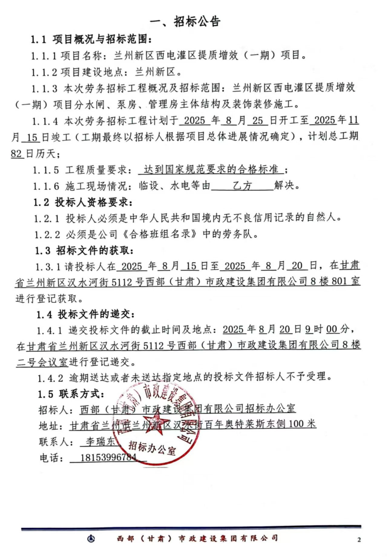 兰州新区西电灌区提质增效(一期)项-劳务分包-招标公告
