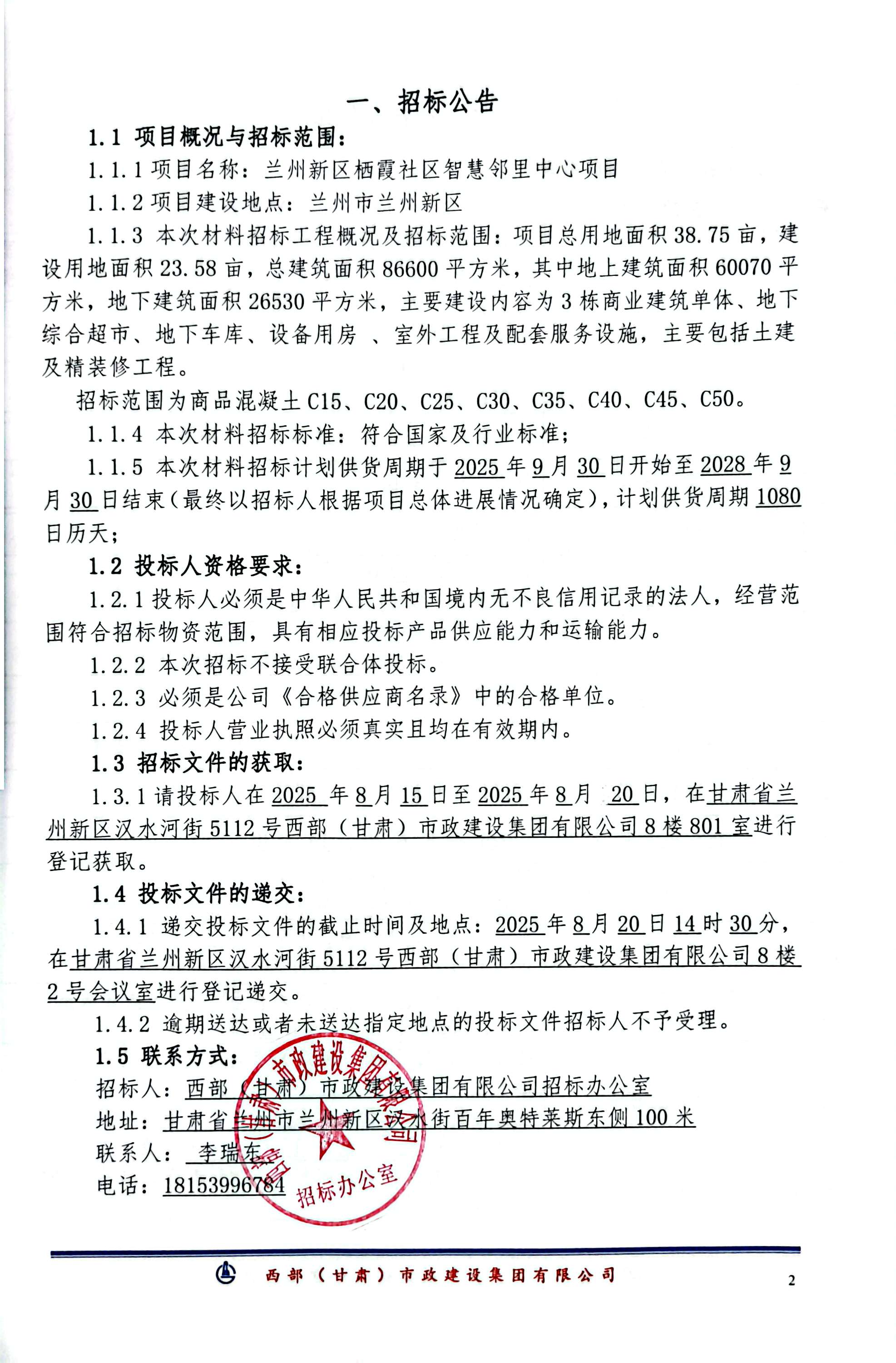 兰州新区栖霞社区智慧邻里中心项目-商品混凝土-招标公告