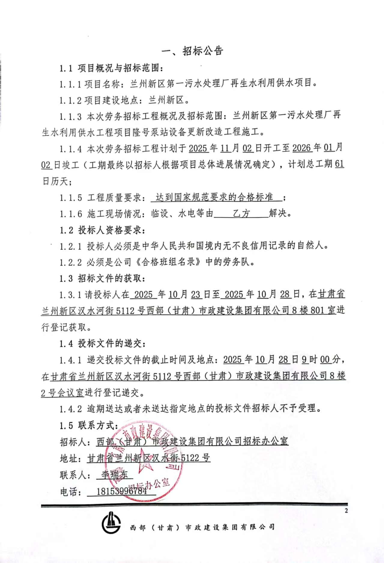 兰州新区第一污水处理厂再生水利用供水项目-招标公告